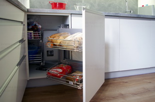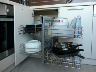 Drátěný výsuv v rohové skříňce.
