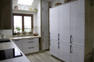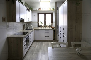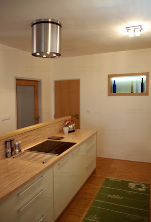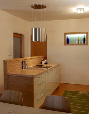 Kuchyně navazující na obývací pokoj v laku vysoký lesk a dubu Winchester. Výklenek prosvětluje sousedící spíž.