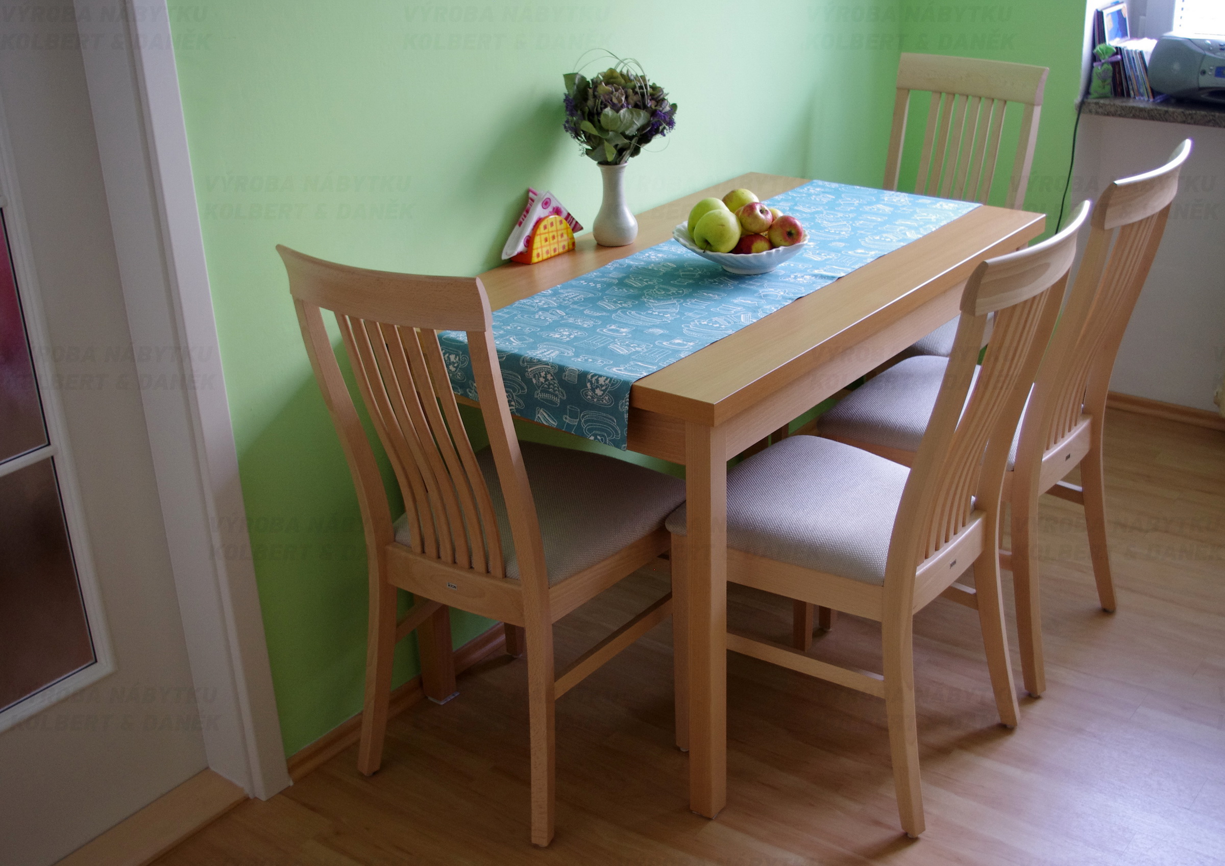 Jídelní stůl atypického rozměru s bukovou podnoží a deskou z lamina.