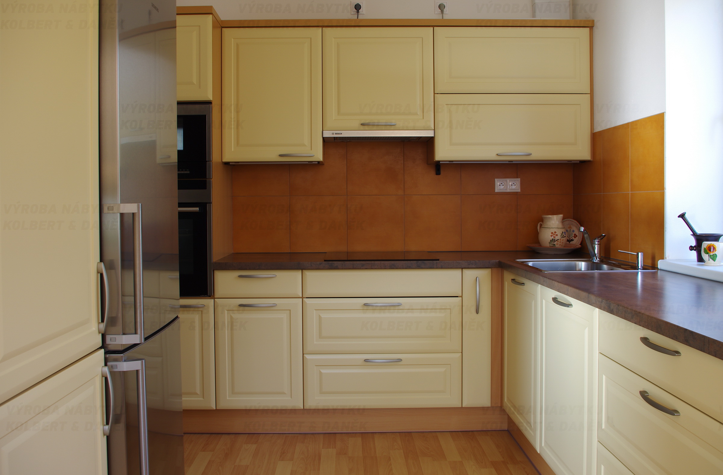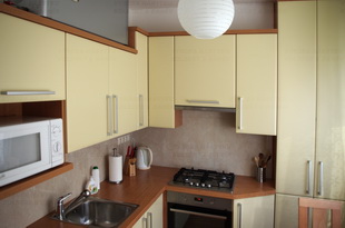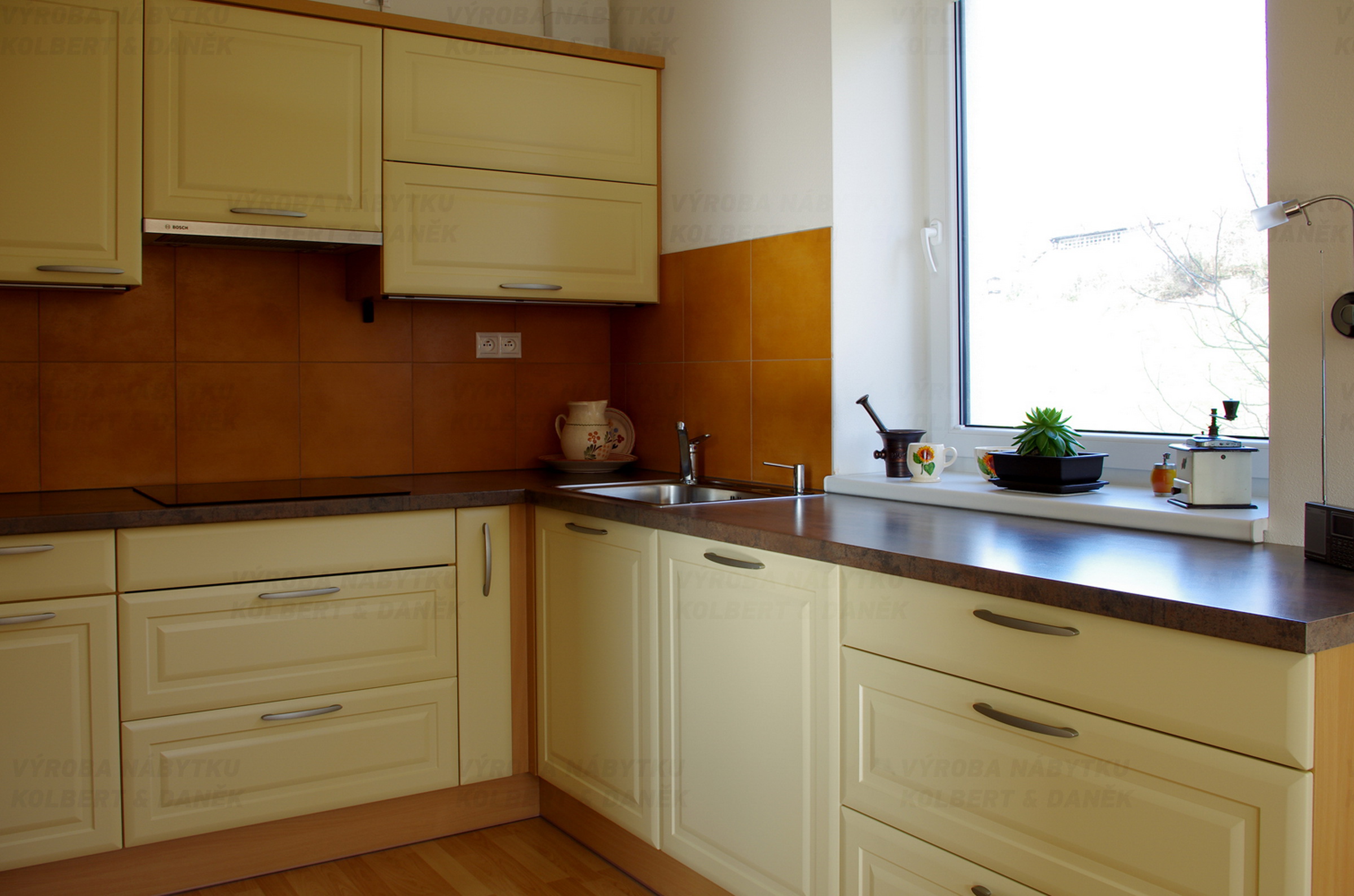 Tradiční malá kuchyně ve folii vanilka má prakticky vyřešenou pracovní plochu i úložné prostory.