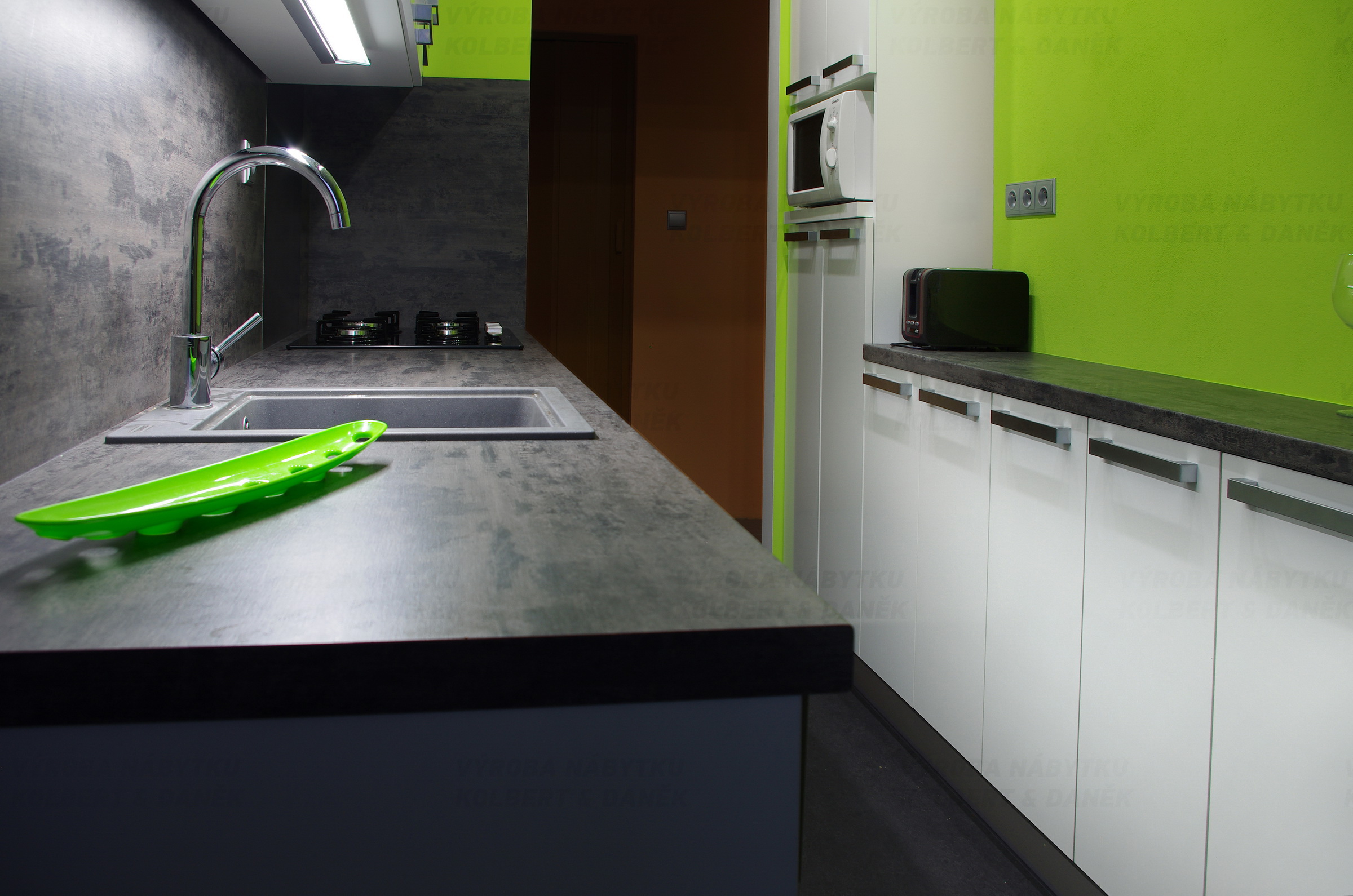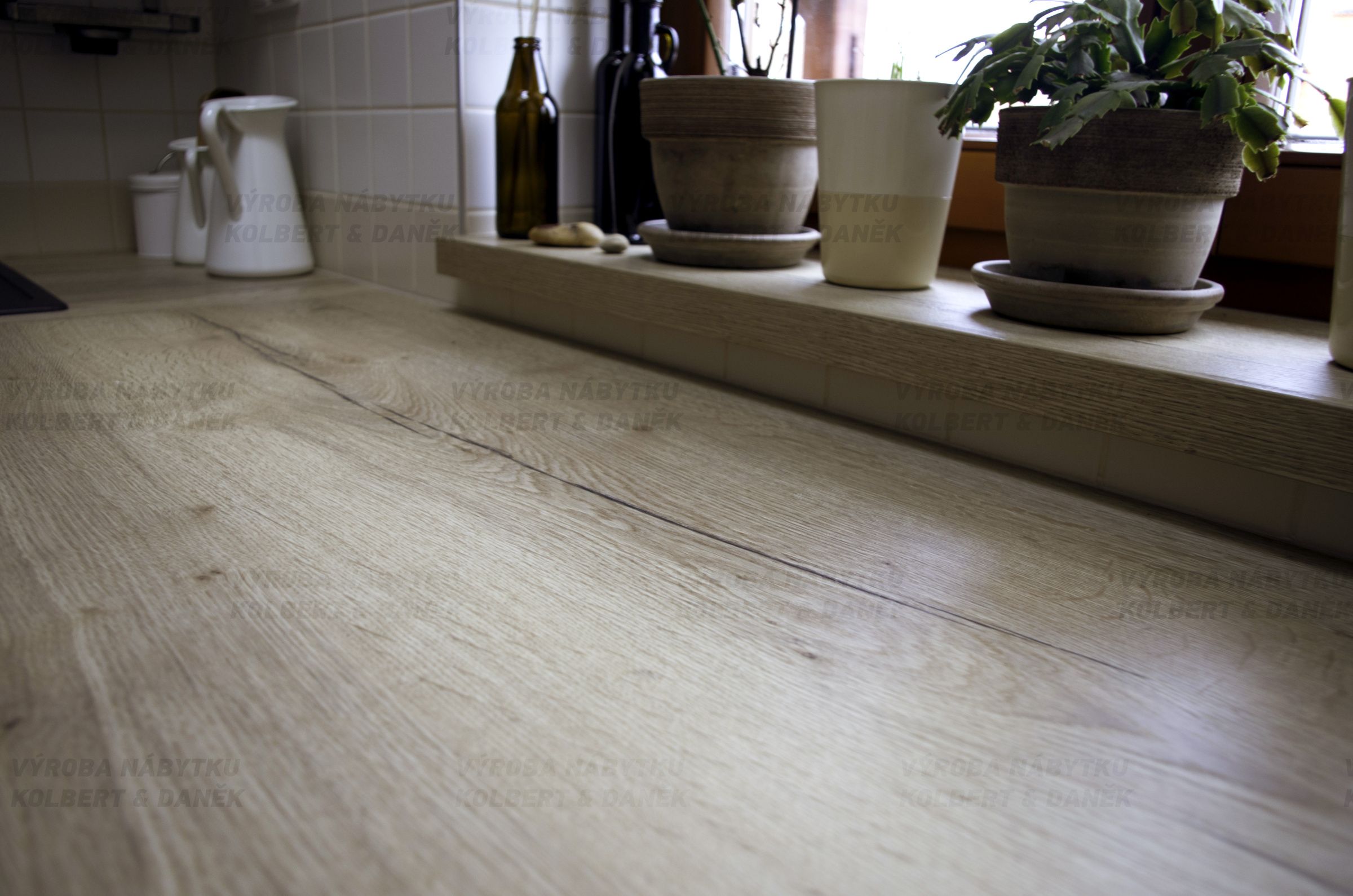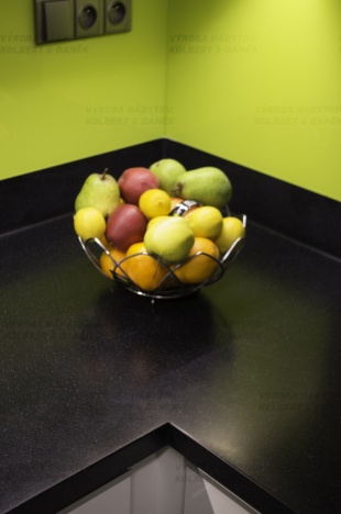 Pracovní plochu osvětluje LED pásek v hliníkovém profilu. Okno z pískovaného Conexu prosvětluje koupelnu a tvoří zajímavý detail.