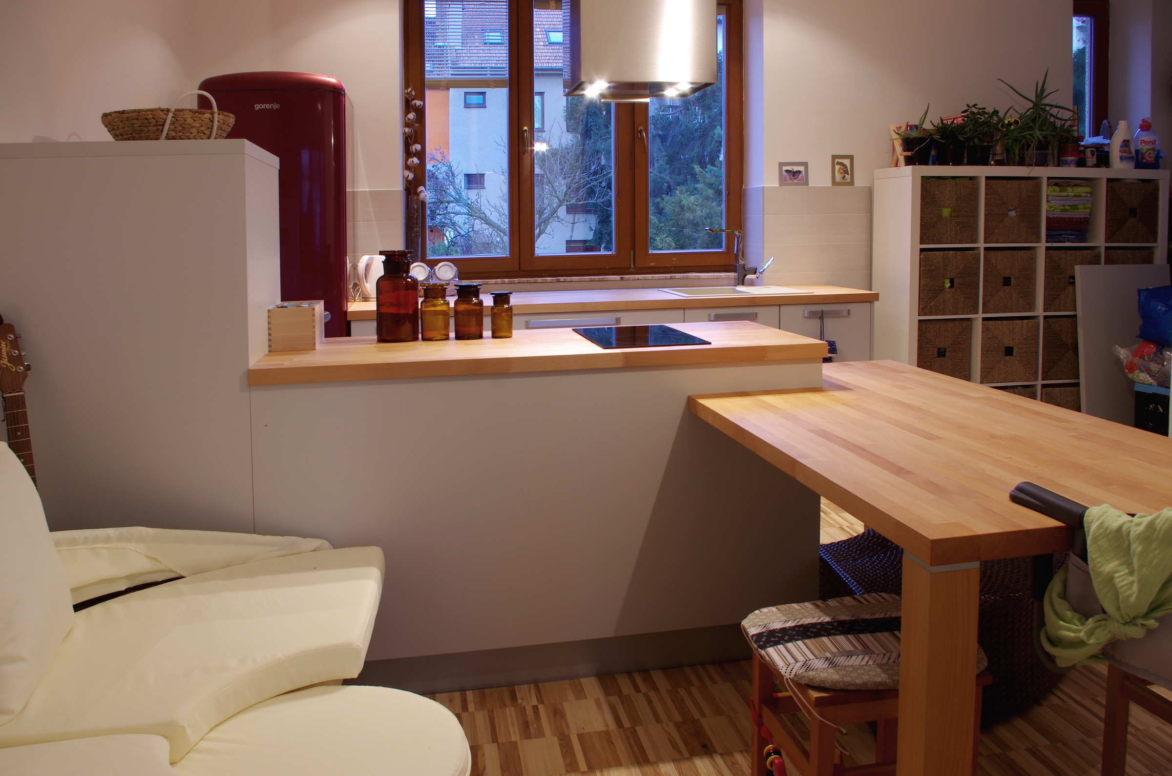 Originálně řešená kuchyně s masivní deskou z olejované bukové spárovky a přisazeným jídelním stolem.