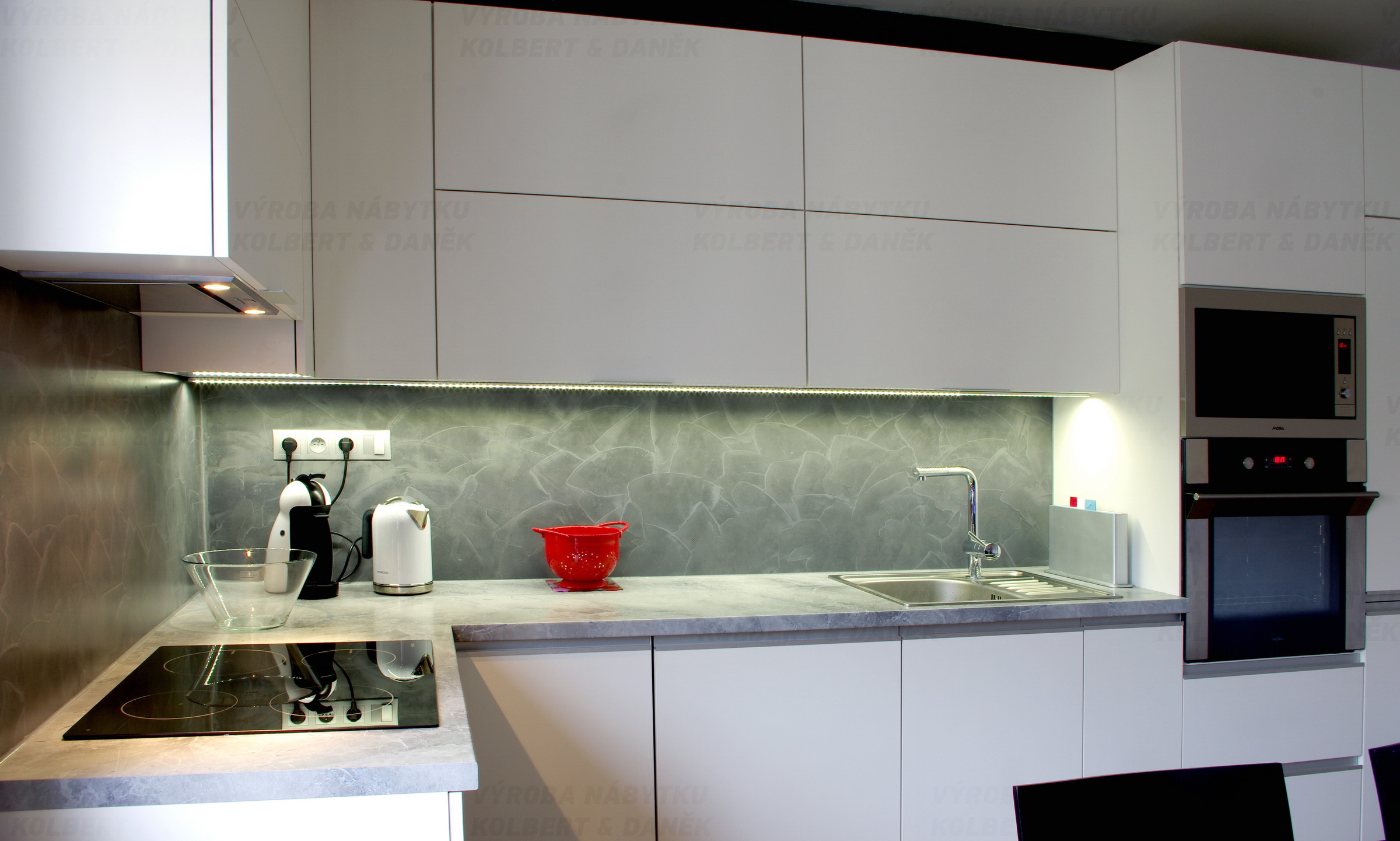 Elegantní kuchyně v bílém laminu má místo obkladů omyvatelnou omítku Pandomo.
