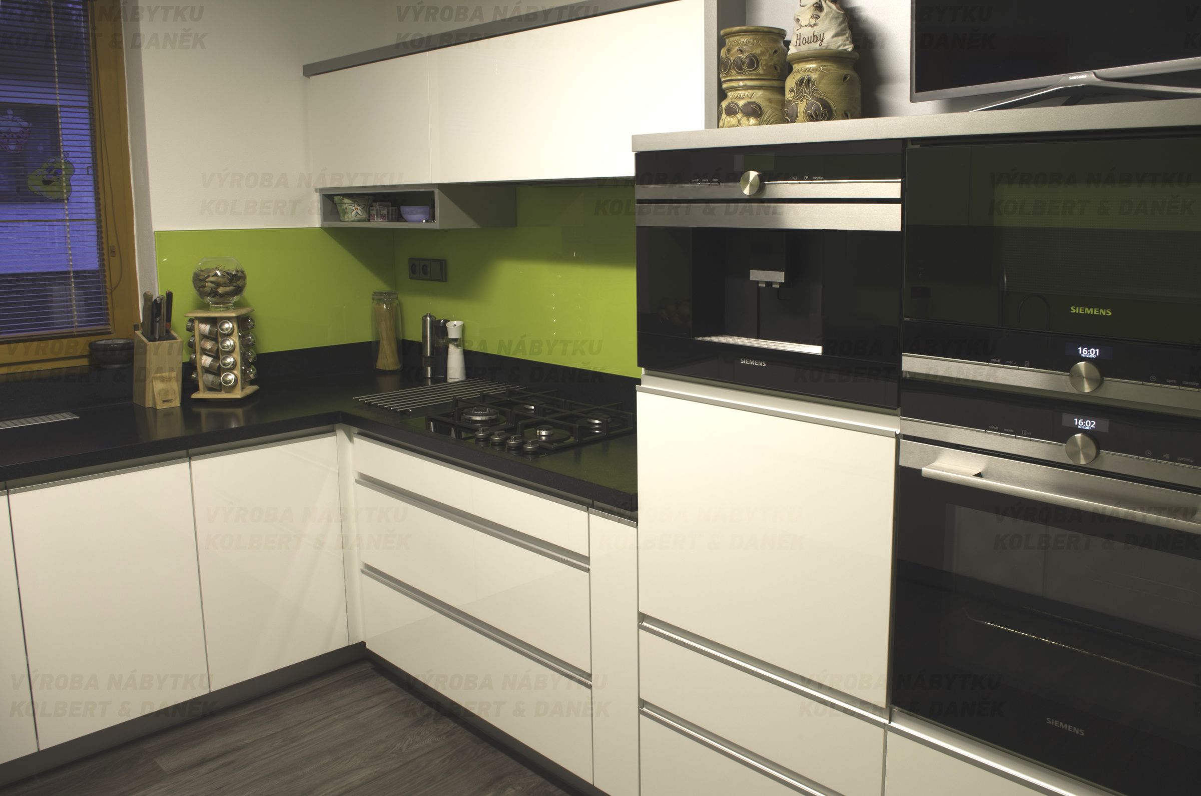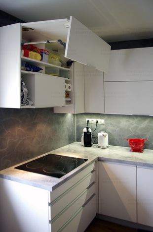 Moderní kuchyně v laku vysoký lesk. Skříňka s dvojitým výklopem má přes odvážný rozměr dokonalou funkci díky kování Blum Aventos.