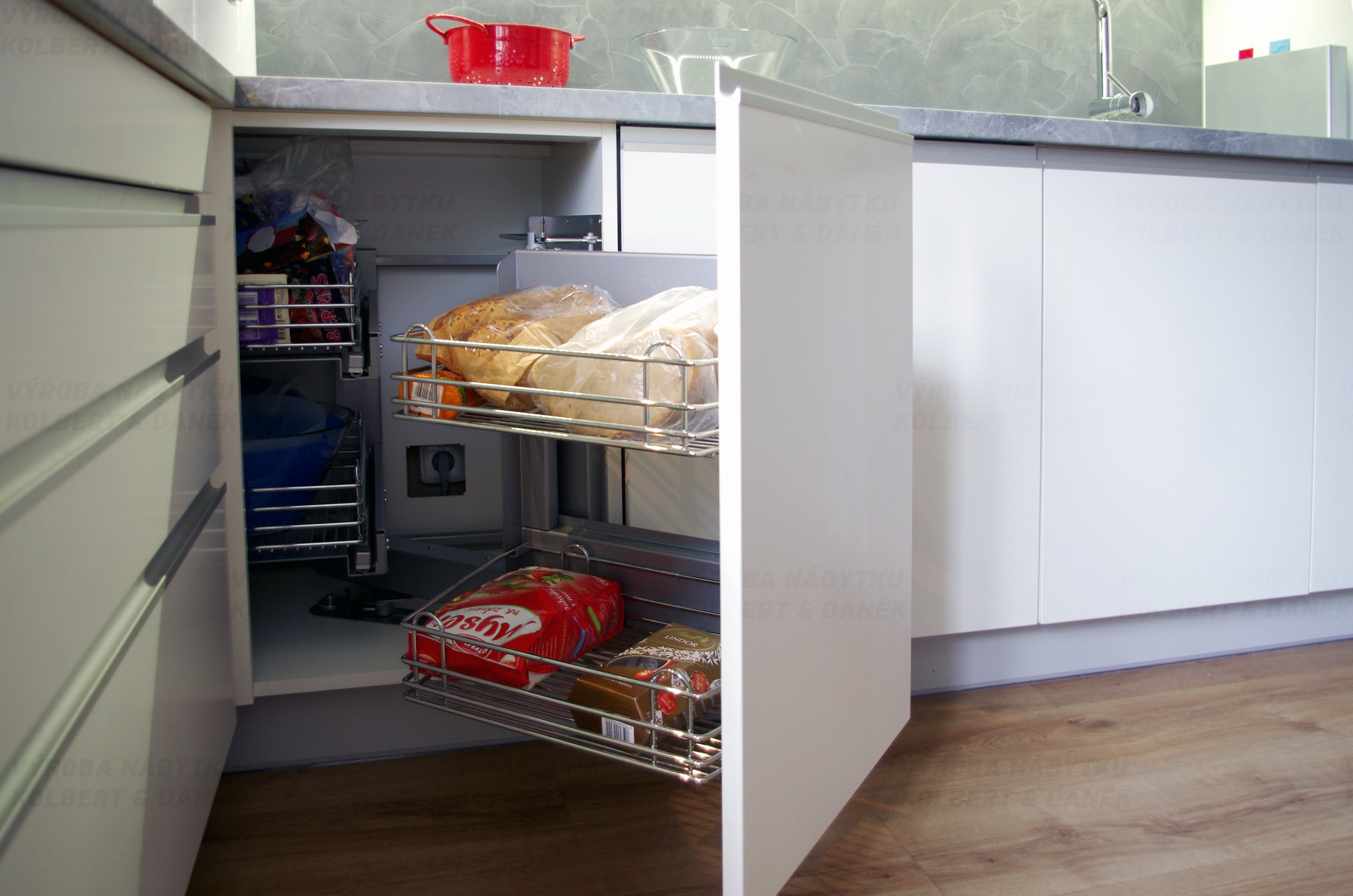 Díky výsuvným drátěným košům je skvěle využit rohový prostor.
