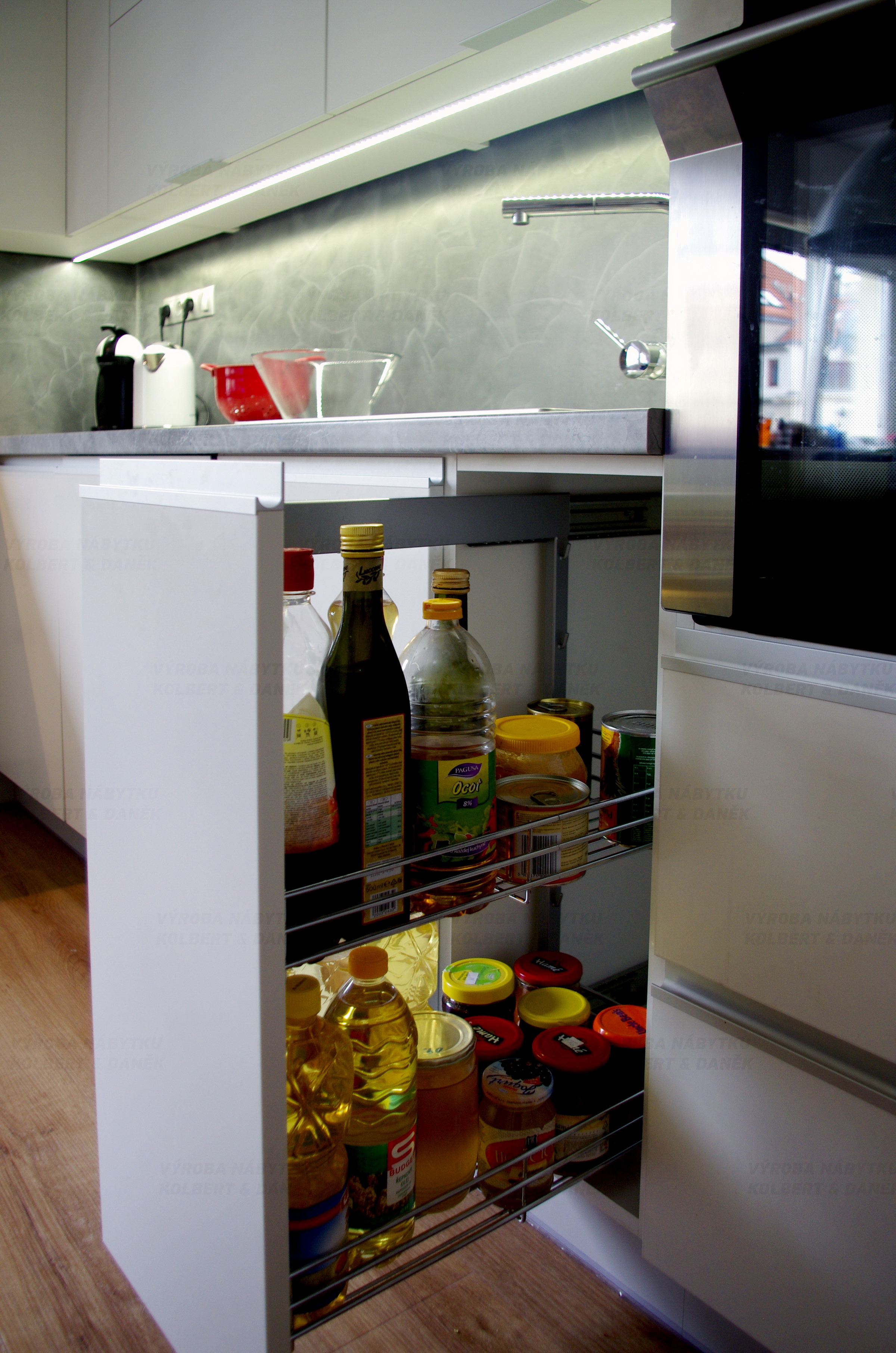 Vnitřní zásuvky ve spižní skříni umožňují dobrý dosah a využití prostoru.