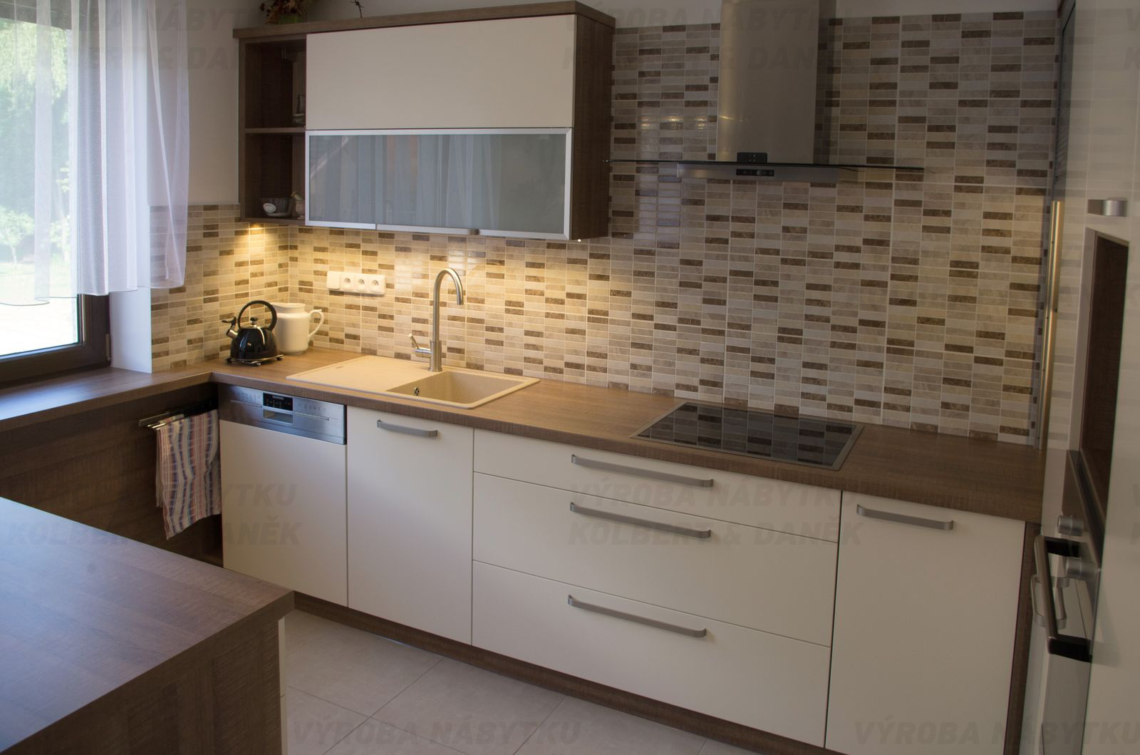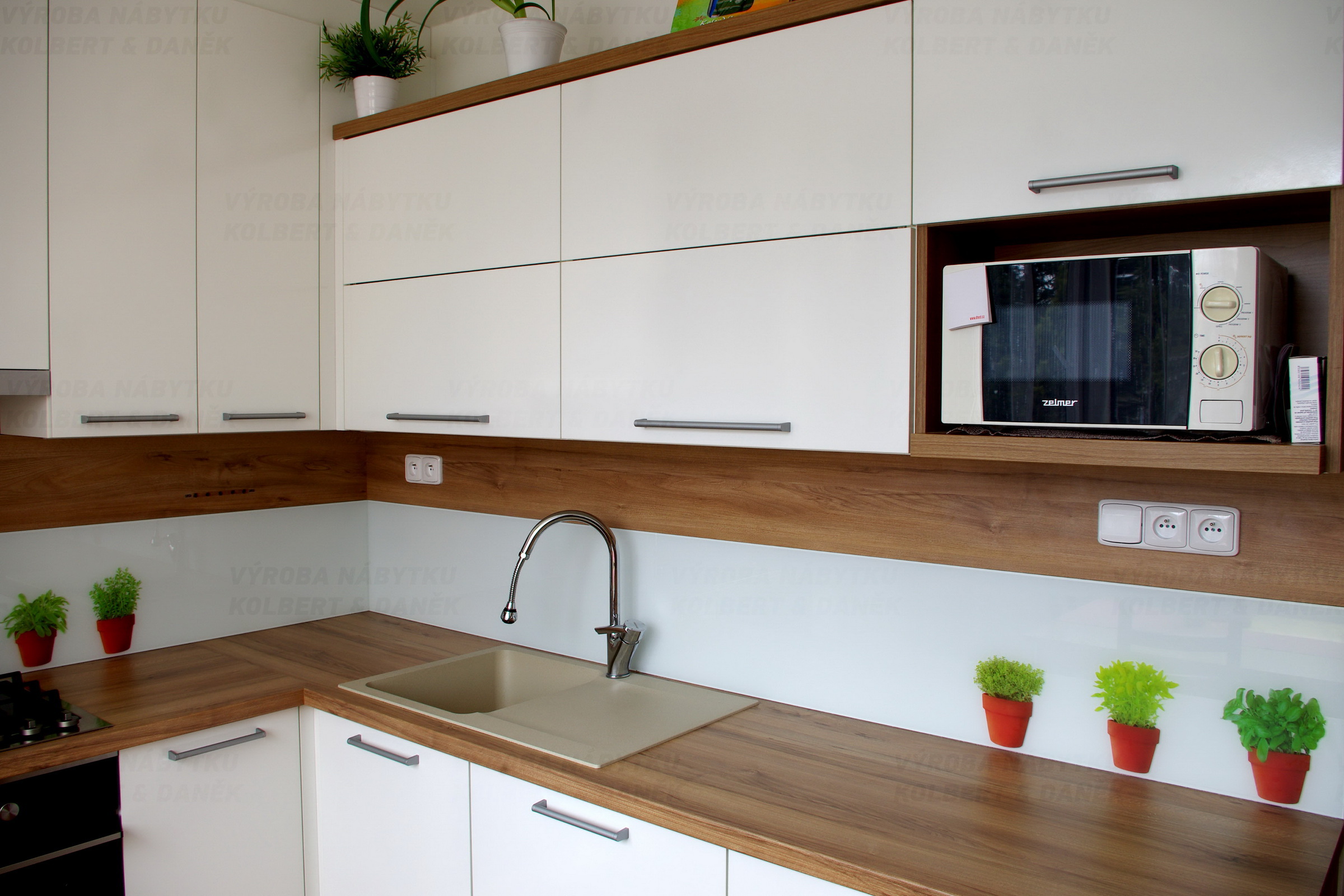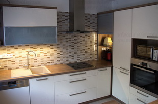 Kuchyně v dekoru bílý lesk a ořech s obkladem z tvrzeného skla.