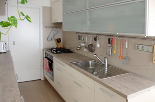 Promyšlené praktické řešení malé kuchyně ve vanilce a olši je přizpůsobené speciálním potřebám úzkého prostoru.